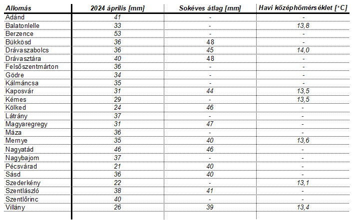 Az alábbi táblázatban az áprilisi vízállások és a sokéves havi jellemzők láthatók az átlagtól való eltéréssel: