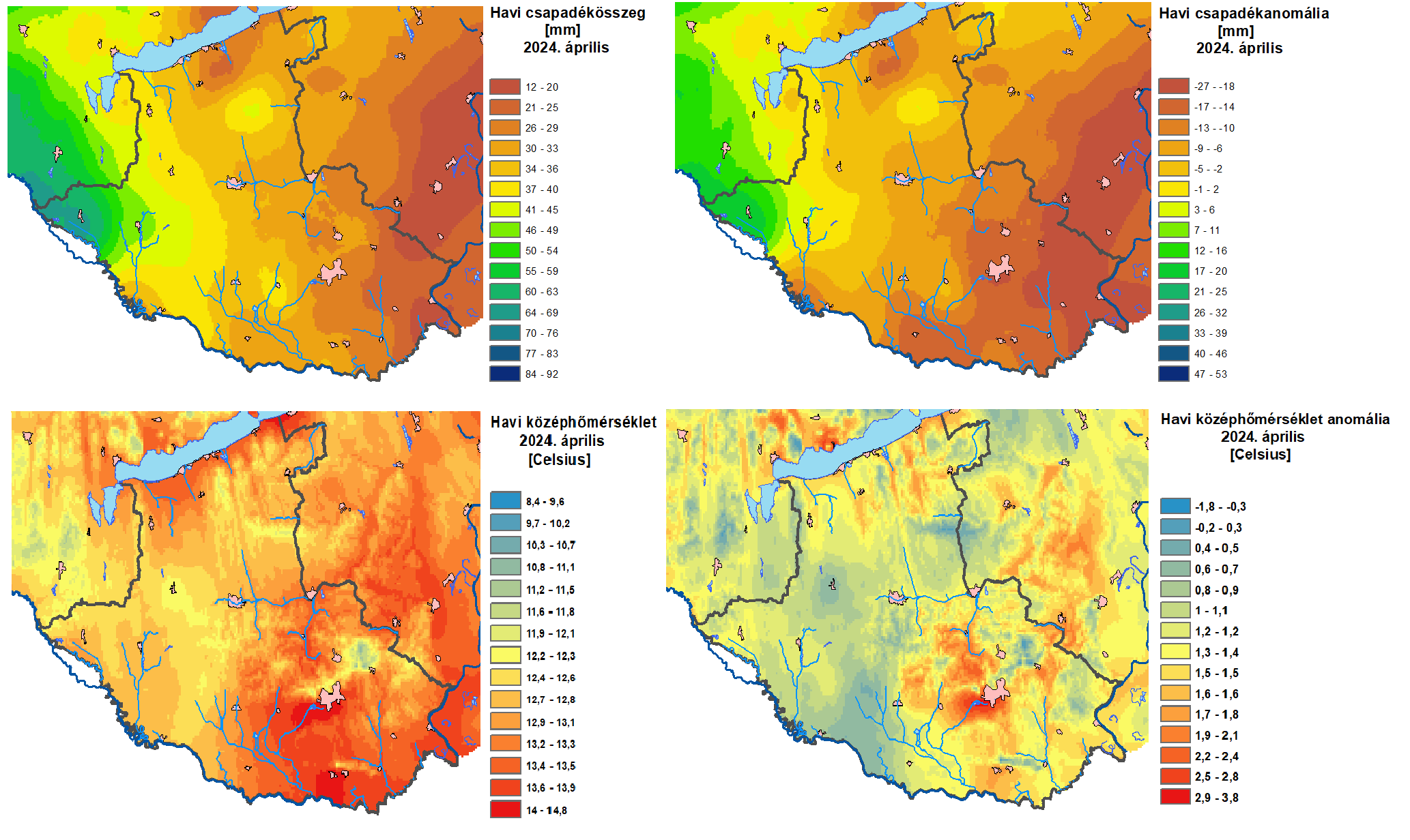 Áprilisban a Duna átlag vízhozama 2445 m3/s volt, ami 284 m3/s-mal volt kevesebb a sokéves átlagnál. A Dráva Barcsnál mért átlag vízhozama 594 m3/s volt, ez 80 m3/s-mal több a sokéves havi átlagnál. A kisvízfolyások esetében is jelentősen elmaradtak a sokéves átlagértékektől az áprilisi átlag vízhozamok értékei.