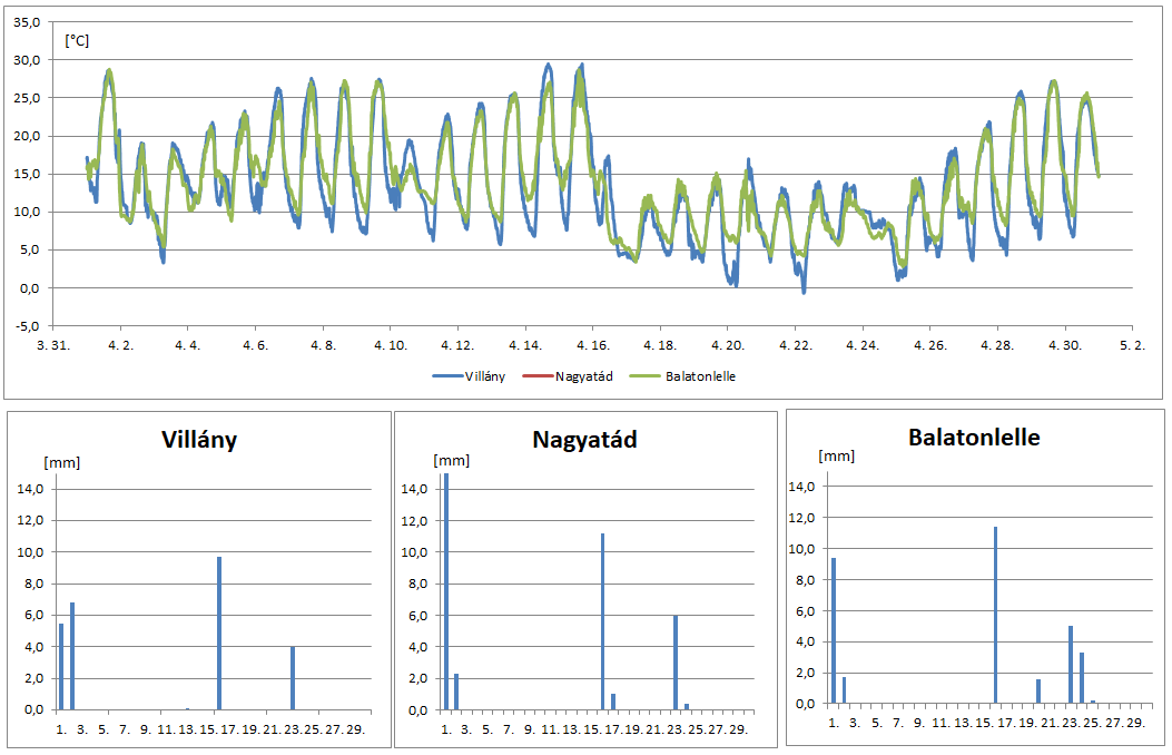 Az idei április középhőmérséklete 13,5 °C körül alakult. Ez nagyjából megfelel a szokásos értéknek. Azonban az átlag eltakarja, hogy a hónap eleje jelentősen melegebb volt a megszokottnál, míg a hónap közepén érkező hidegfront jelentősen csökkentette a léghőmérsékleteket. Csapadék szempontjából az idei április elmaradt a szokásostól. Jellemzően a keleti, délkeleti területek voltak a szárazabbak.