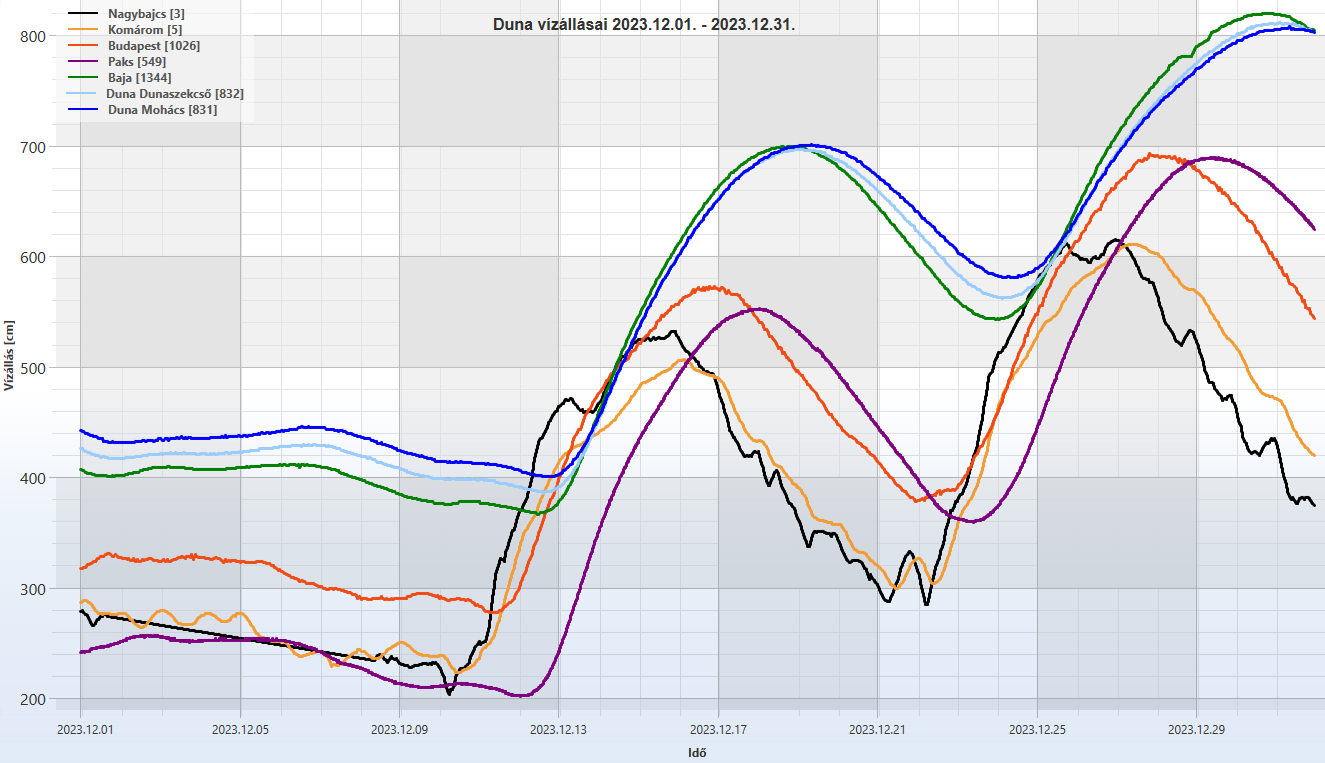 Az előző hónaphoz hasonlóan decemberben is a dunai vízállásokban áradó tendencia volt megfigyelhető, hónap végi maximum vízállásokkal. A mohácsi szelvényben a minimum vízállás december 12-én 401 cm, a maximum érték pedig 31-én 808 cm volt. A folyó középvízállása Mohácsnál 568 cm volt, ami jelentősen, 289 cm-rel meghaladta a sokéves (1990-2022.) decemberi átlagot. A hónap második felében két árhullám is levonult a Dunán, a vízgyűjtő területre hullott nagy mennyiségű csapadék és a hóolvadás következtében. Az első árhullám Nagybajcsnál meghaladta az I. fokú árvízvédelmi készültség szintjét az 532 cm-es tetőző vízállással, ami Mohácson 702 cm-rel tetőzött. A második árhullám ennél jelentősebb volt, Nagybajcsnál III. fokú készültséget rendeltek el. Budapesten a Duna 693 cm-rel tetőzött december 27-én (az alsó rakpartot 645 cm-nél éri el a víz), Mohácson pedig I. fokot meghaladó, 808 cm-es vízszinttel tetőzött a folyó az év utolsó napján.