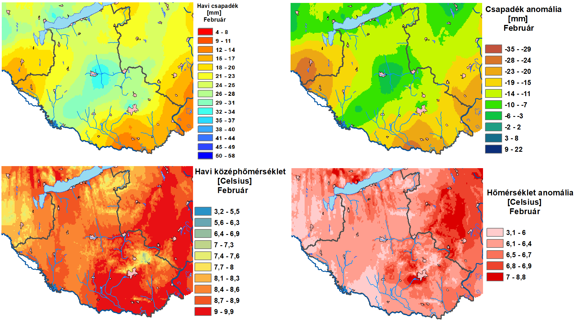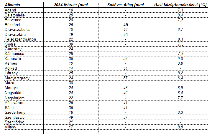 2024 februárja rendkívül enyhe volt, olyannyira, hogy a mérések kezdete óta messze a legmelegebbnek bizonyult. A havi középhőmérsékletek 7,5 – 9,0 °C körül alakultak, ami rendkívüli módon-, 6,0 – 7,0 °C fokkal volt magasabb a sokéves átlagnál. A lehullott csapadékmennyiségek mindenütt elmaradtak a szokásos értékektől. A legtöbb csapadék az Igazgatóság területének középső részén esett, míg a legkevesebb délen, délkeleten.