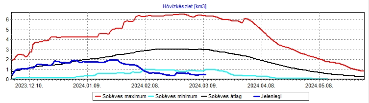 A folyó vízgyűjtőjén a hóban tárolt vízkészlet februárban a sokéves minimum alatt alakult, és továbbra is csökkenő tendencia figyelhető meg.