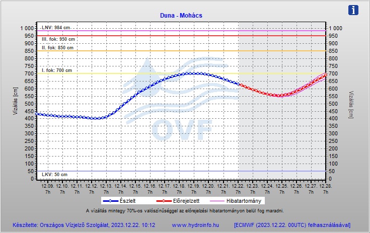 Jelen számítások szerint a Duna Mohácsnál január első hetében I. fokot meghaladó vízállással fog tetőzni.
