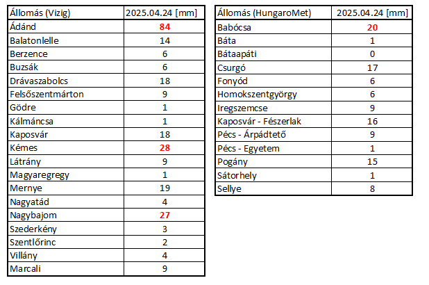 A tegnapi nap során a gyenge hidegfront érte el hazánkat. Az amúgy is labilis légkörben ez sok helyen záporokat, zivatarokat okozott. A DDVIZIG határai belül három olyan terület volt ahol jelentősebb csapadék hullott le. Az egyik délen Drávaszabolcs, Kémes környezetében. Itt bizonyos helyeken 20 – 30 mm csapadék hullott le. Jelentősebb csapadék hullott Nagybajom környékén, a zivatarokkal látogatott helyeken 30 mm körüli lehullott csapadékkal. A legtöbb csapadék azonban Tab, Ádánd körzetében esett, ahol egyes helyeken bőven 30 mm-t meghaladó csapadék hullott le. Tegnap Ádándon a csapadékmérő műszer adatai szerint 84 mm csapadék hullott le.